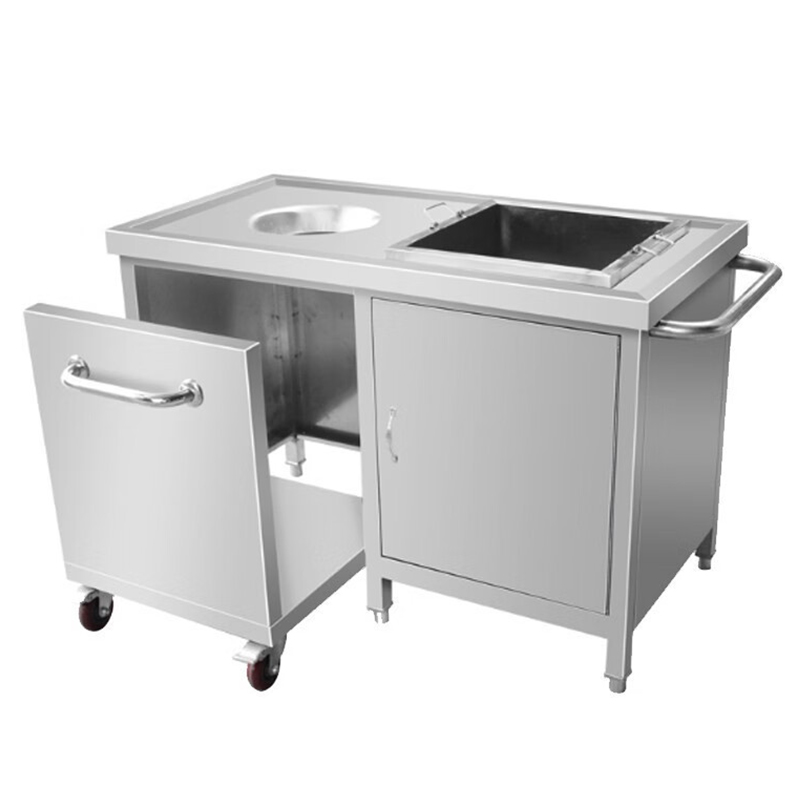 1、采用優質不銹鋼板制造,臺面板厚1.0mm2、面板下襯δ15木工板減噪,木板下復鋁板3、側板、后背板1.0mm,門內復板1.0mm4、門外板、柜內層板、底板厚1.0㎜5、配推車,可以放垃圾桶6、配φ50不銹鋼重力腳